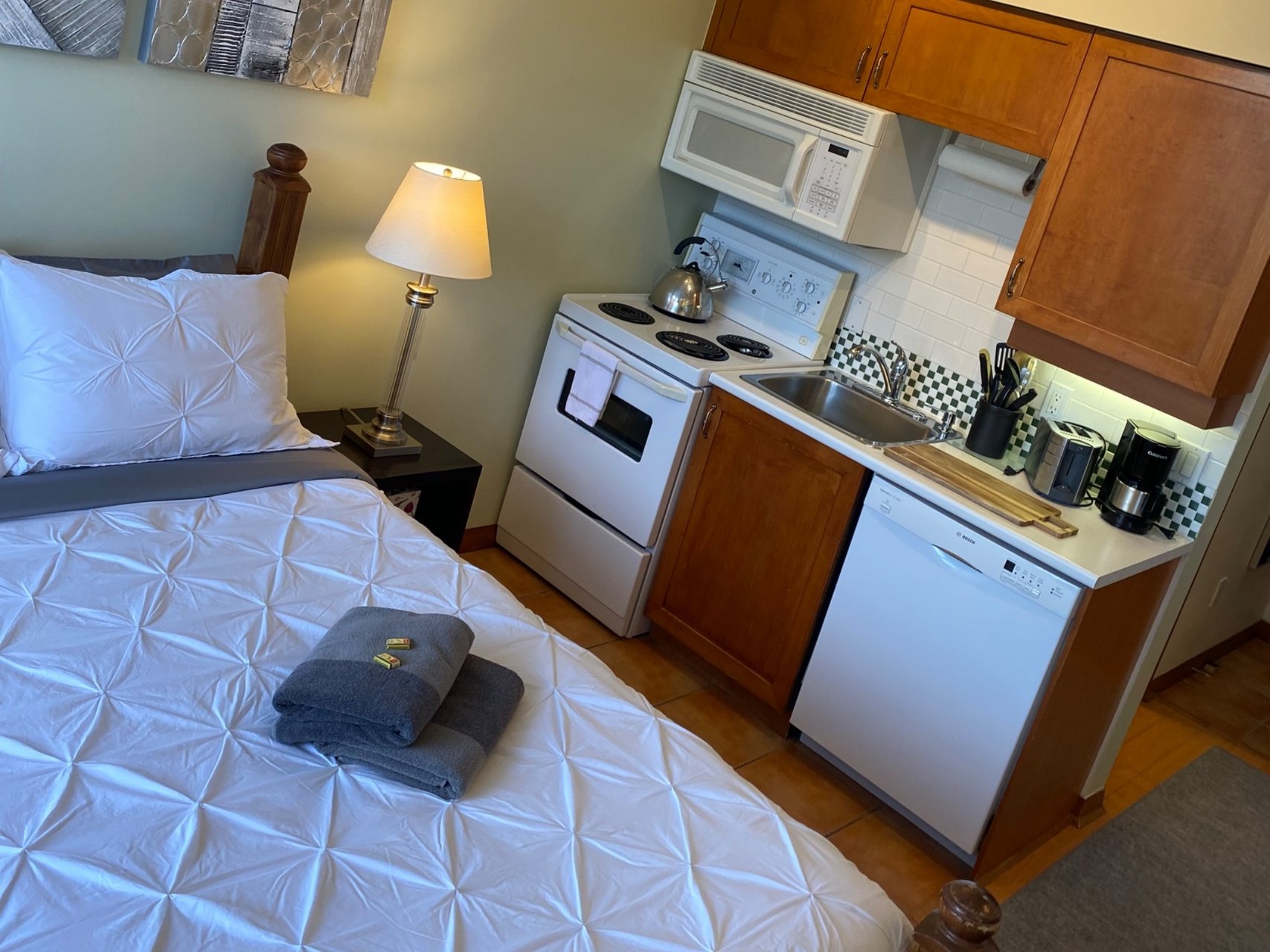 Kitchenette with full size fridge, microwave, stove/oven. Small but fully equipped.