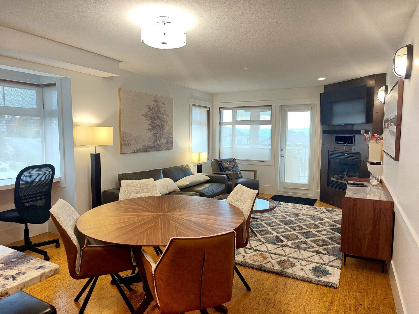 Welcome to Raven 309, a bright and modern mountain retreat where comfort meets convenience. From the lounge and private deck, enjoy sweeping views of the Monashee Mountains while you relax by the fire or unwind in your private hot tub. The open-concept living space features a cozy sofa set around the fireplace, paired with a 55" 4K UHD TV—ideal for movie nights or streaming your favorite shows after a day on the slopes.