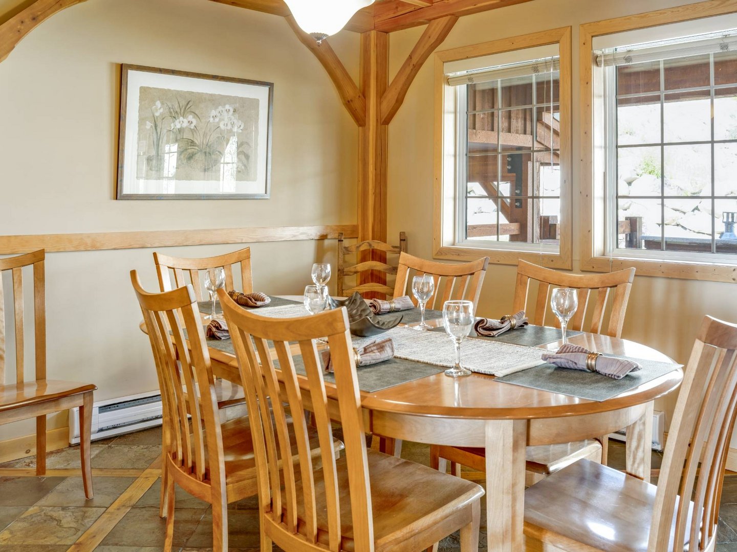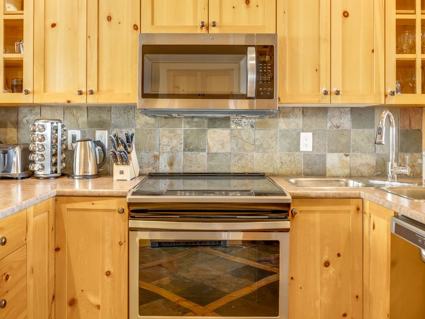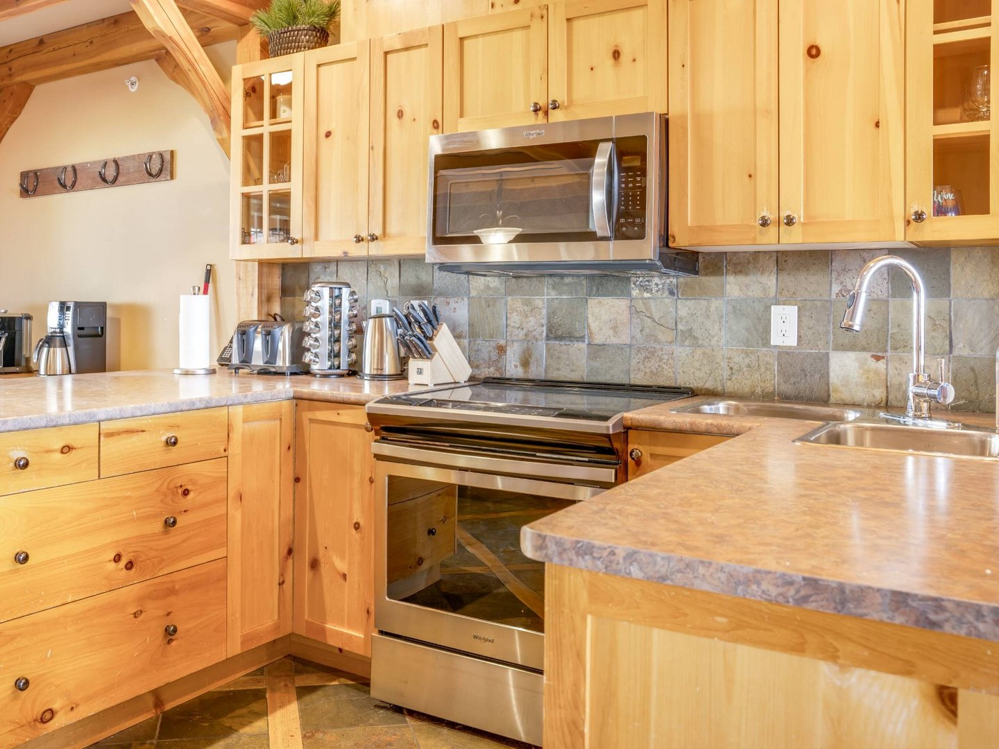 The kitchen and dining areas face to the north side of the unit with the kitchen right in the middle. The rear deck has a BBQ for your grilling pleasure. The 3rd floor has two queen masters with ensuite bathrooms in each. The top floor is the bunk room with a double over double and a single over single bunk beds.