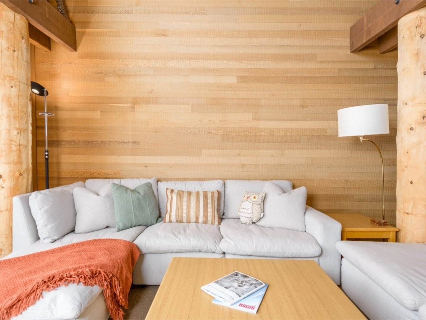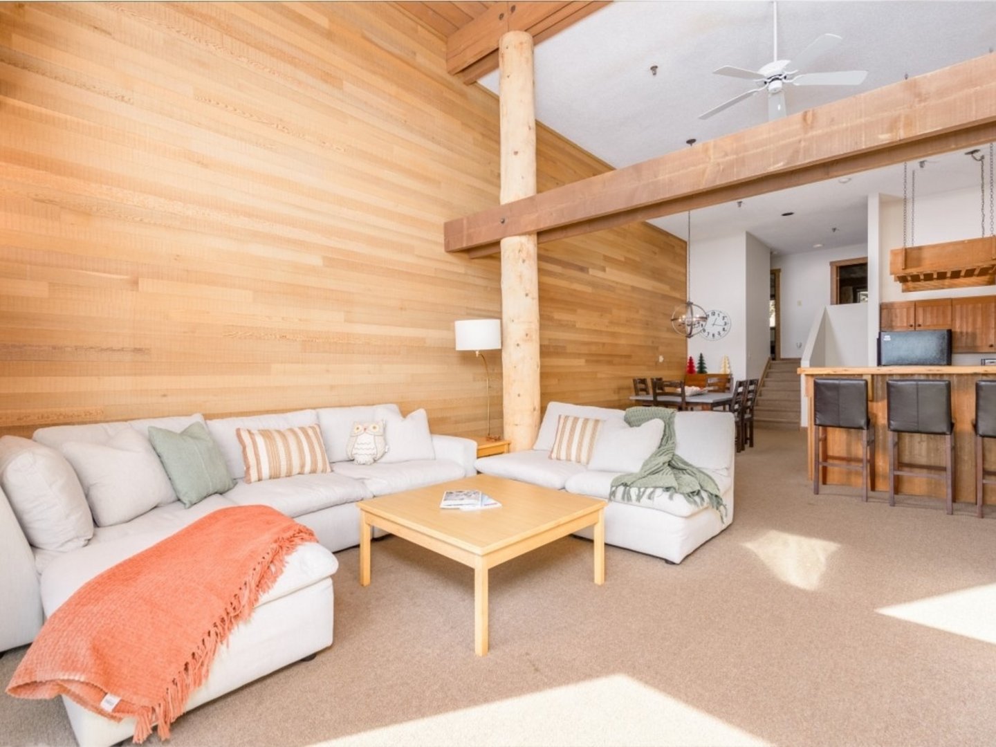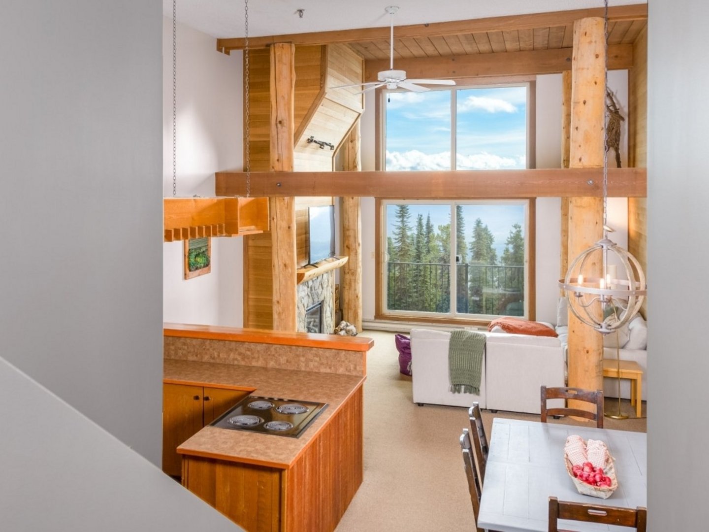Living Area: The inviting living area is perfect for family time, with cozy seating surrounding a gas fireplace. The flat-screen TV ensures entertainment for all, while large windows provide stunning views of the snow-covered landscape.