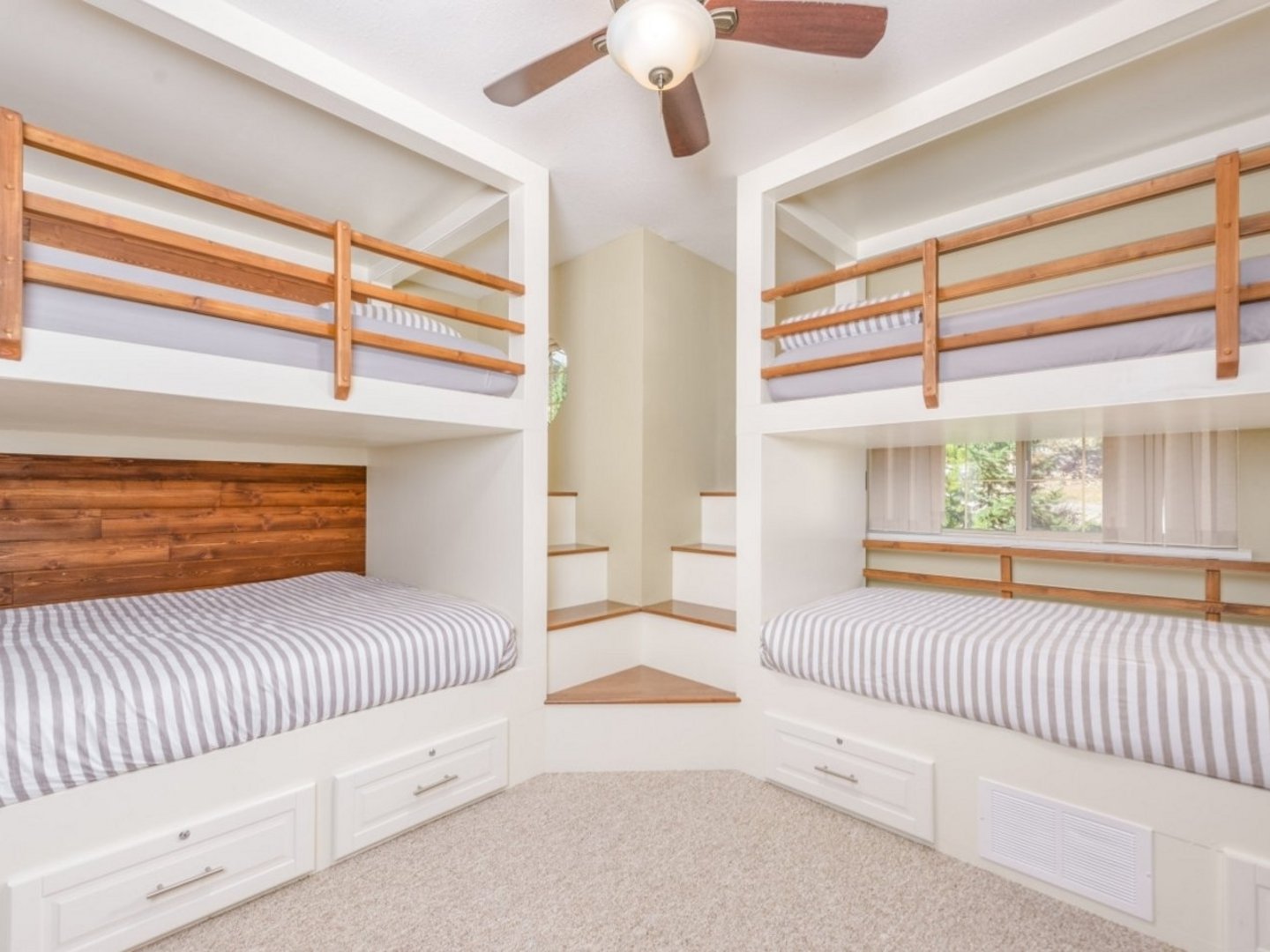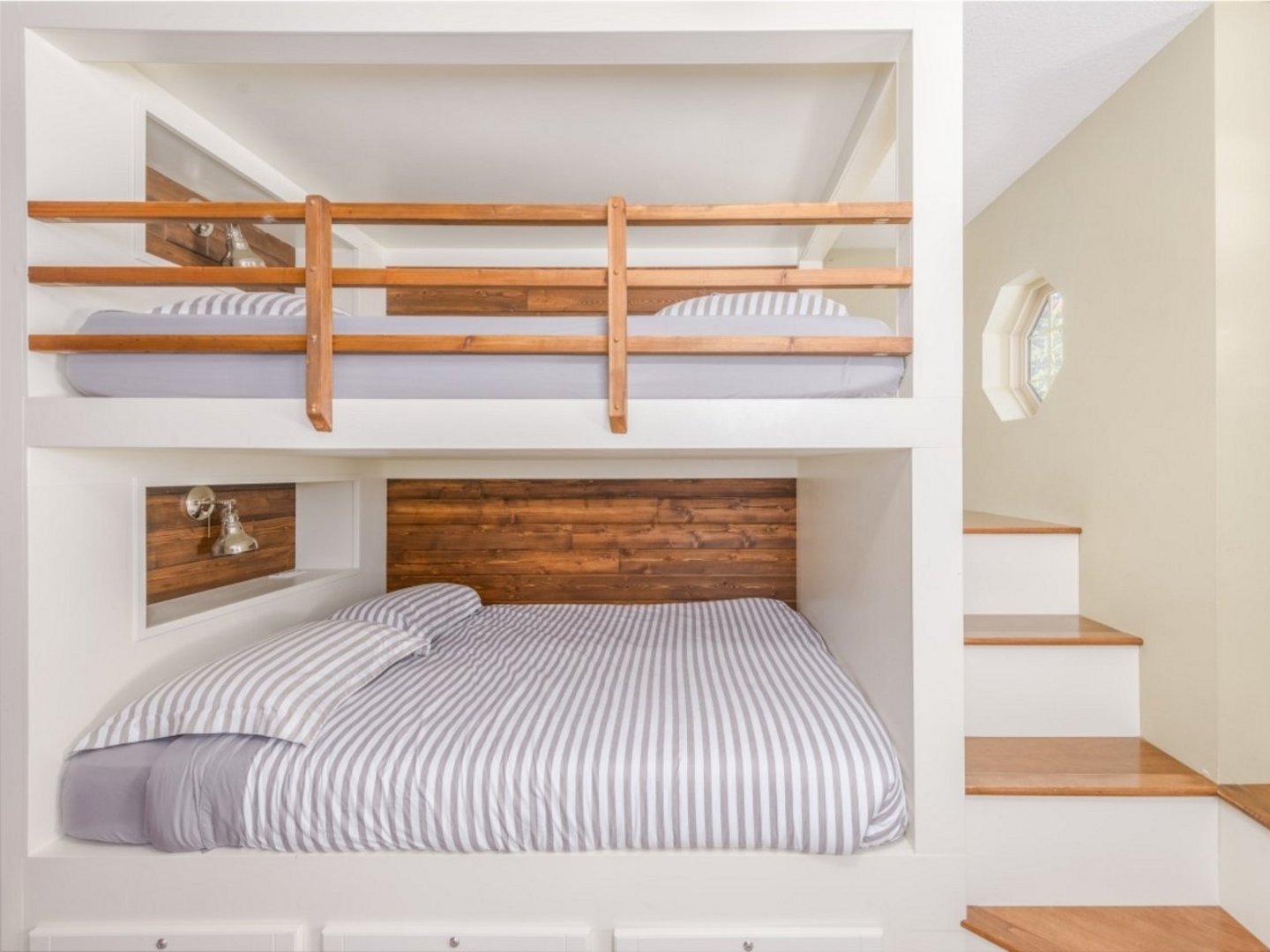 - The bunk room is a great space for kids, featuring two bunk beds. One twin-over- twin and queen over queen.