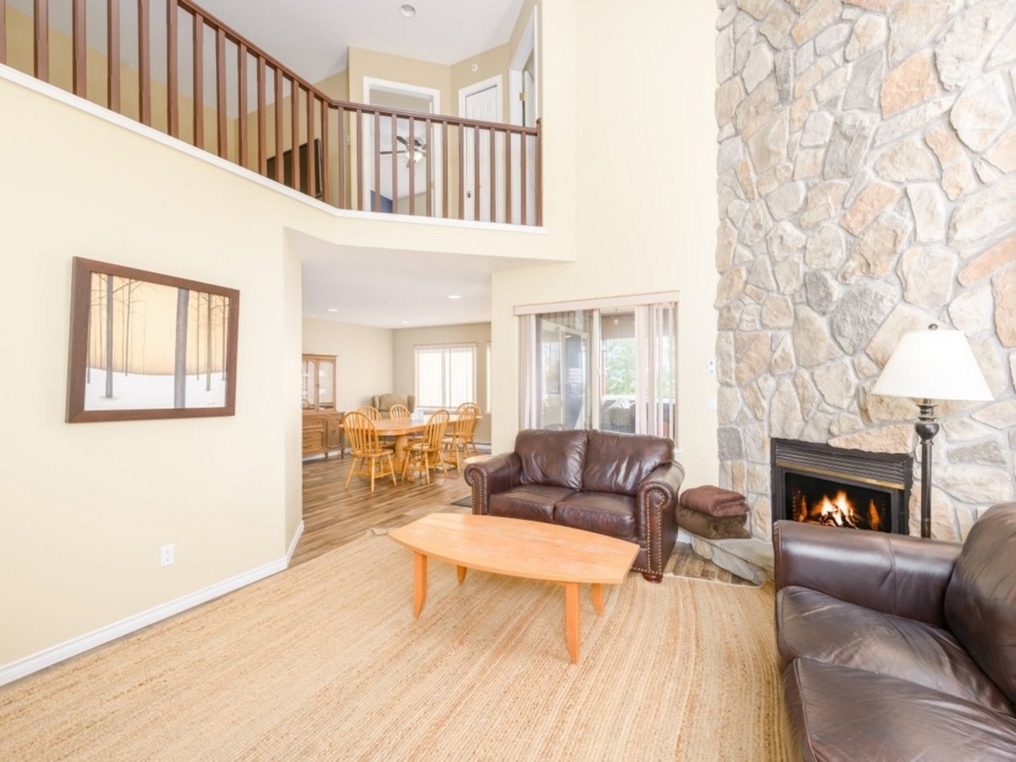 The open-concept living area features large windows that flood the space with natural light, offering beautiful views of the surrounding snow-covered pines. Comfortable couches surround a gas fireplace, perfect for relaxing after a day on the slopes. A flat-screen TV provides entertainment for cozy nights in.