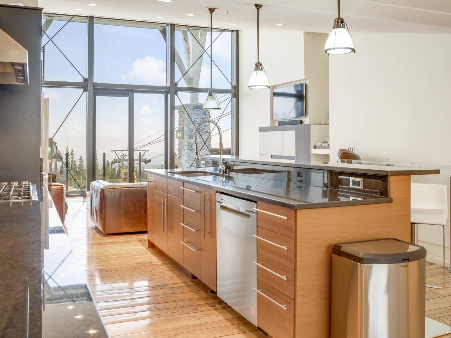 The heart of the home is designed for connection — an expansive open-concept kitchen, dining, and lounge area that invites socializing after a day on the slopes.