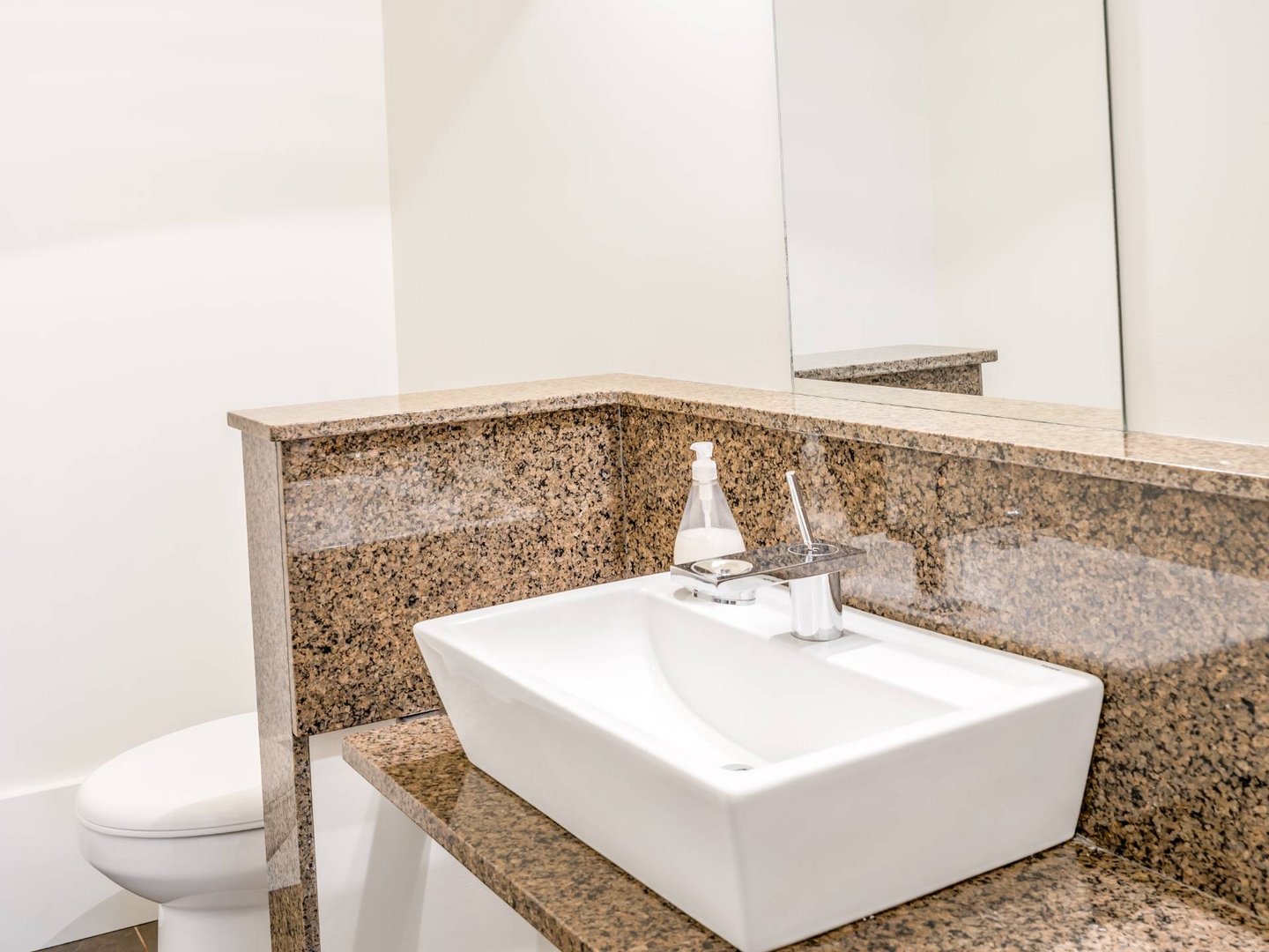 The home includes three full bathrooms with modern fixtures and calming finishes, plus a powder room on the top floor for added convenience while entertaining.