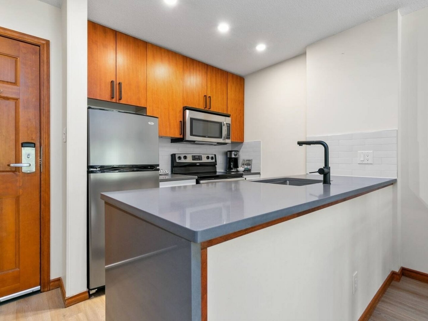 This updated ground floor, 1 bedroom / 1 bathroom home is located in The Aspens Lodge on the slope side of Blackcomb Mountain. It features a renovated kitchen, stylish cozy living area with gas fireplace and boasts a lively court yard view.