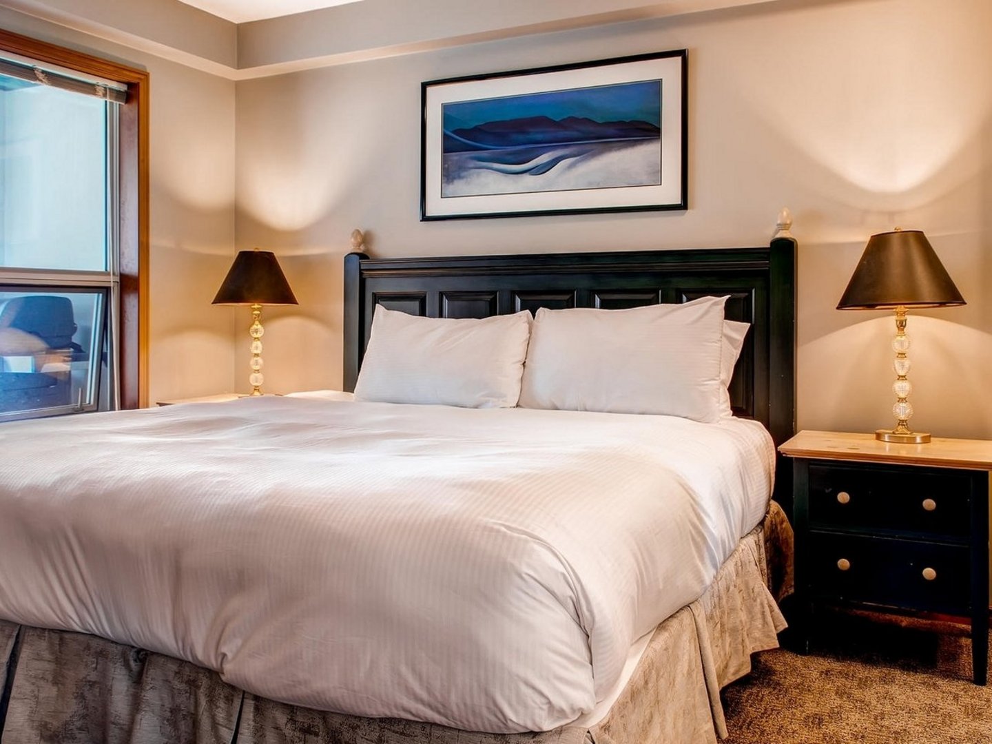 Ideal for couples seeking extra comfort, the unit sleeps two and includes air conditioning in the master bedroom, two flat screen TVs with cable, and a fully equipped kitchen for easy dining in. With two full bathrooms, guests enjoy added privacy and convenience. After a day on the slopes or exploring Whistler Village, unwind in the lodge’s heated outdoor pool or soak in one of three hot tubs. The Upper Village and Blackcomb Gondola are just a short 5-minute walk down the ski hill, with a variety of restaurants and après-ski options nearby.