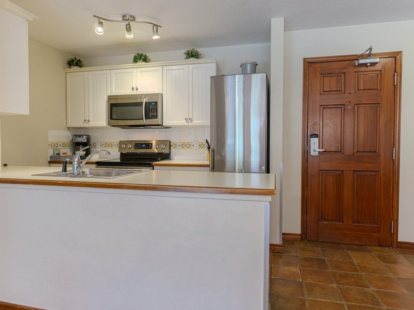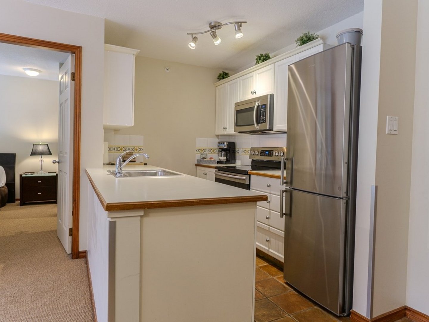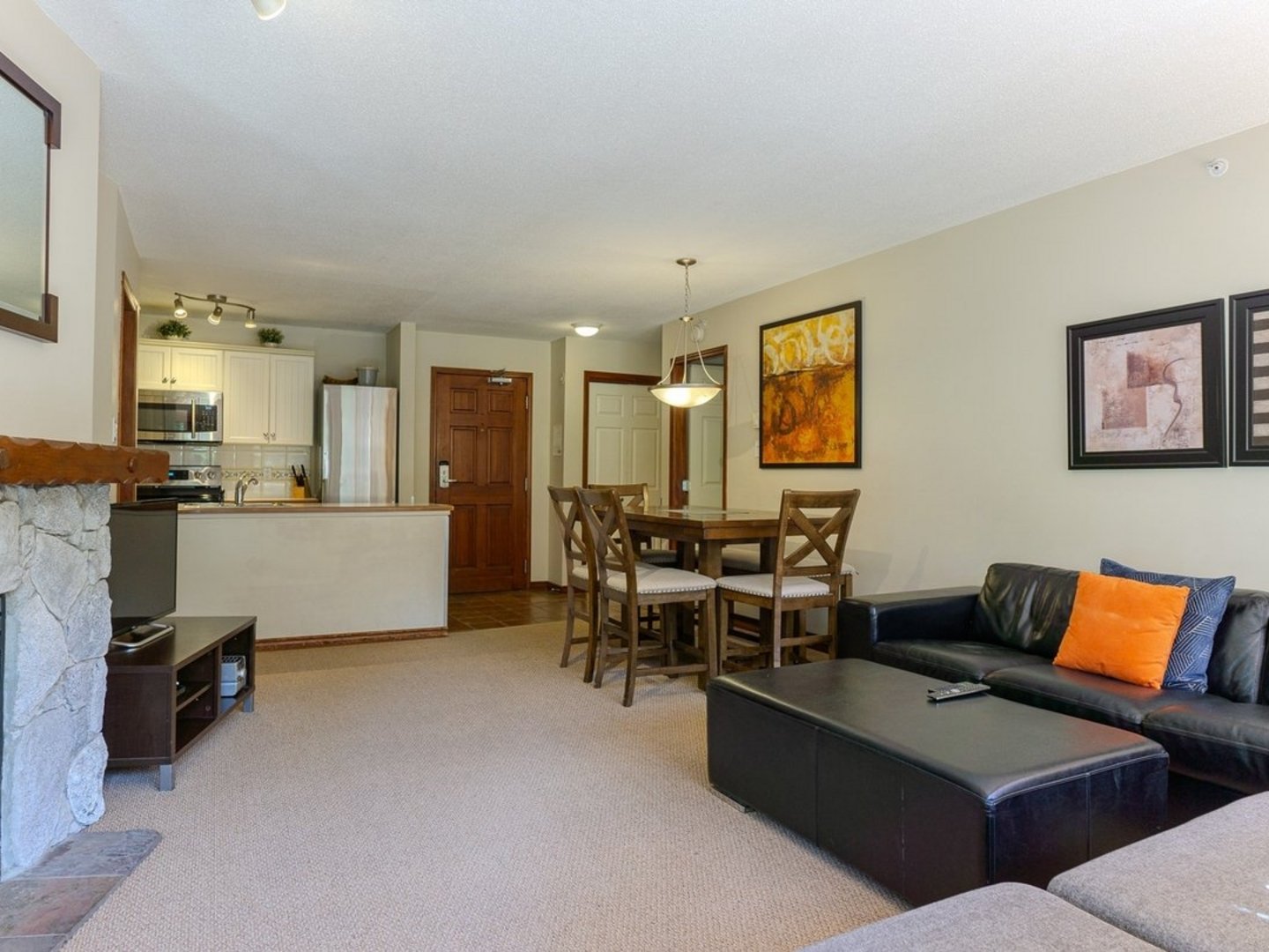 Ideal for families or groups, the unit comfortably sleeps up to eight guests and includes air conditioning in both the master bedroom and living room, three flat-screen TVs with cable, and complimentary Wi-Fi. The fully equipped kitchen makes dining in easy, while the lodge’s heated outdoor pool and three hot tubs offer the perfect way to unwind after a day on the mountain or in the village.