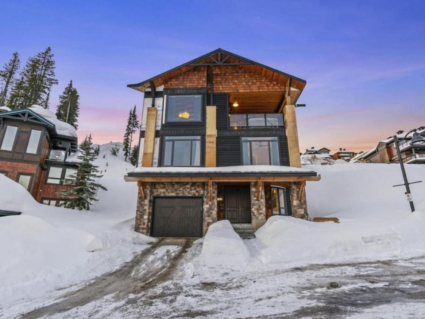 With true ski-in/ski-out access right out the back door, you can glide directly onto the cat track behind the home for quick access to Black Forest. After a day on the mountain, warm up by the fireplace, unwind in the cedar sauna, or soak in the private hot tub while taking in panoramic views of the Monashee Mountain Range and unforgettable south-facing sunsets.