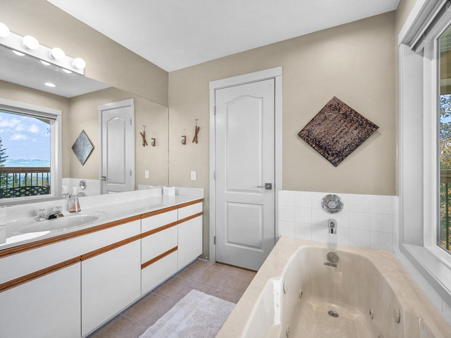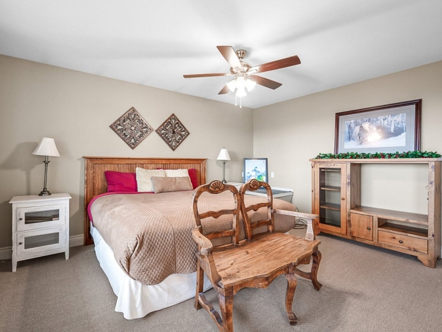 - Bedroom 2 (Primary): Queen bed, ensuite bathroom, private patio with mountain views