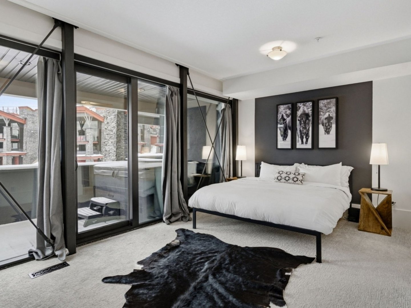 - Primary bedroom with king bed, TV, ensuite, and private balcony with hot tub